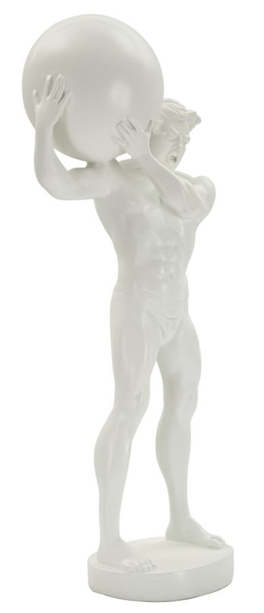 Produkt: Deko klassische Skulptur Replikat von Atlas dem griechischem Titan stehend und die Weltkugel auf den Schultern tragend aus der Mythologie klassische Dekofigur antik-griechische Statue in Weiß in antikem Stil. Laut griechischer Mythologie wurde der Atlas durch Zeus für Kampf gegen die Götter zum Tragen von Weltgewölbe verurteilt. Durch ewige Strafe steht Atlas für unermessliche Stärke und Ausdauer. Nach ihm ist das Gebirge in Nordafrika genannt.