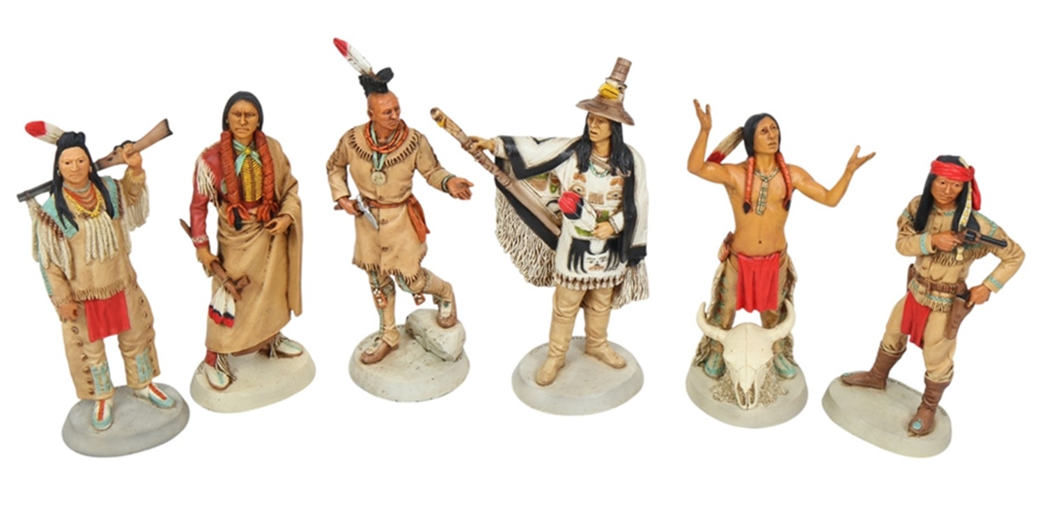 Diese Indianergruppe von berühmten Indianer Häuptlingen und Anführern umfasst folgende Indianerfiguren: Cochise Häuptling der Apachen, Crazy Horse Häuptling von Oglaia Stamm der westlichen Sioux, Quanah Parker Anführer der Comanchen, Plenty Coups Anführer des Stammes Crow, Black Hawk Häuptling der Sauk Fox Indianer, Seattle Häuptling des Duvamish Stammes..